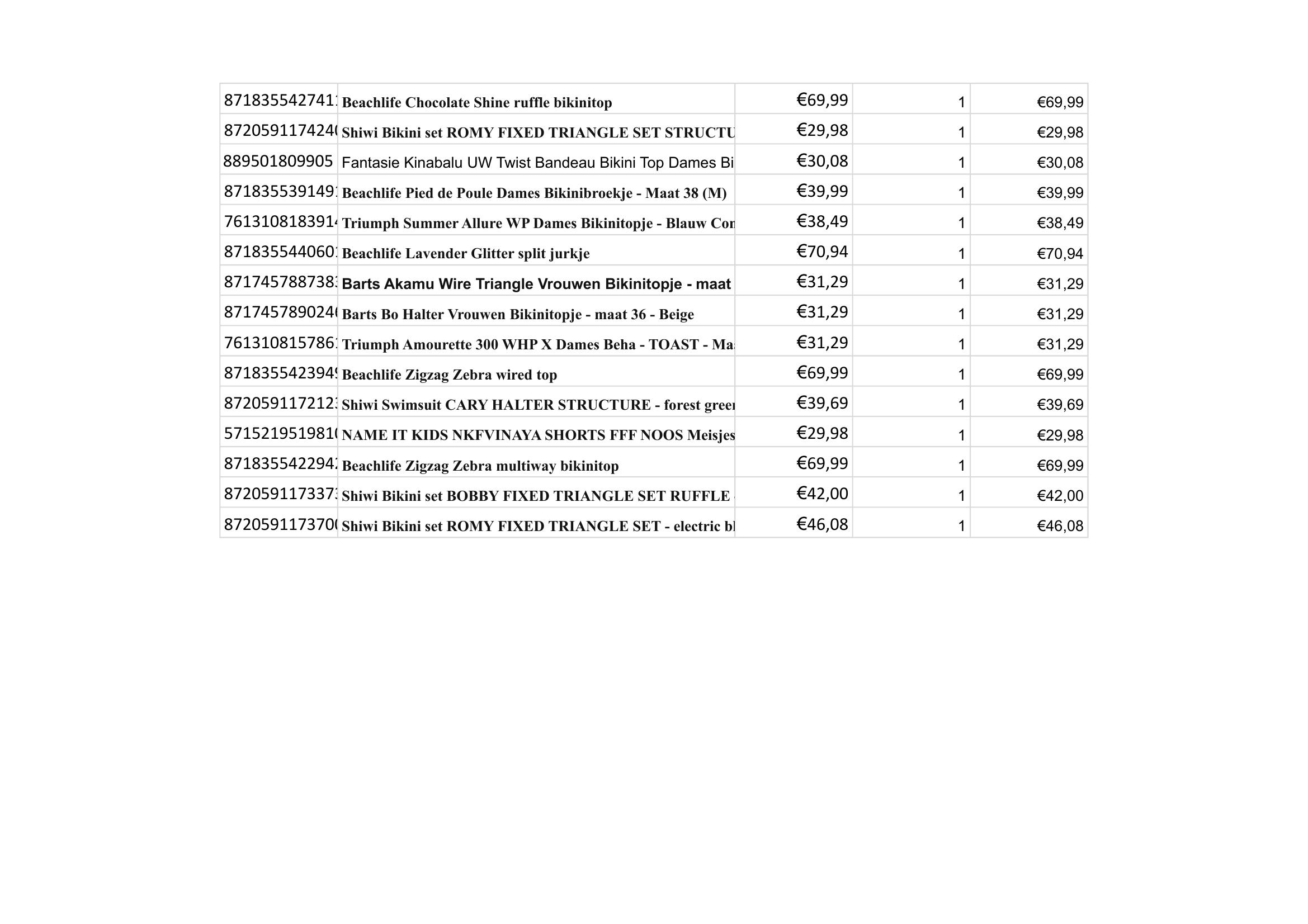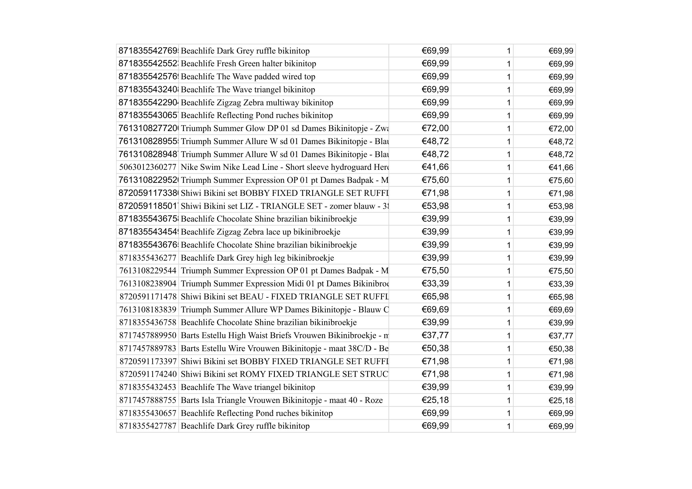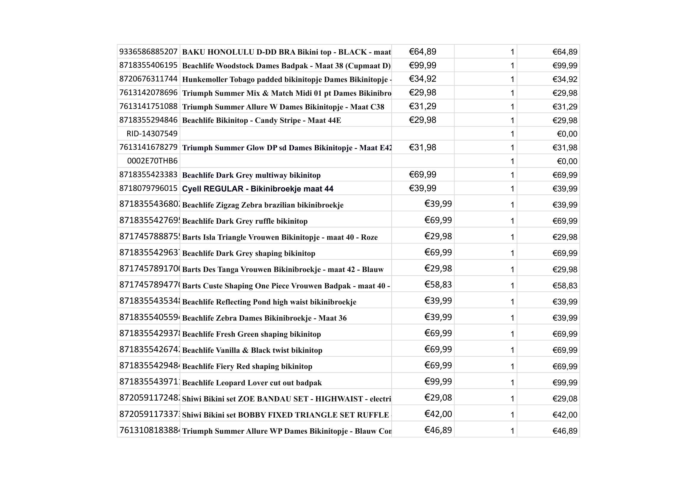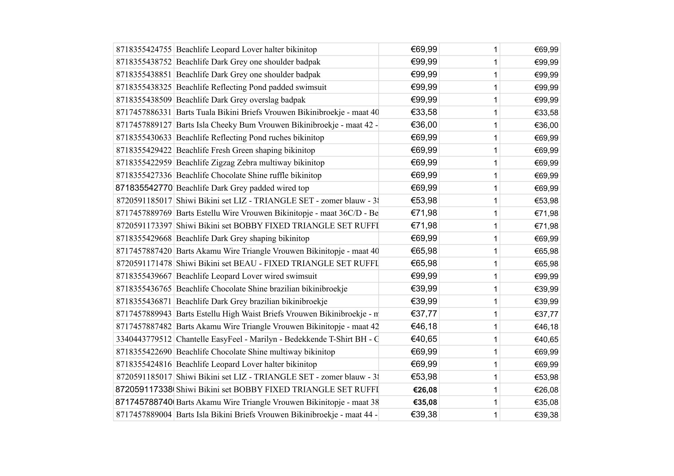 Productbeschrijving: Partij van diverse badmode van onder andere de merken Beachlife, Shiwi en Barts. Alle badmode is nieuw en de partij bevat vele verschillende modellen en maten. Zie de foto's voor de volledige lijst met producten, merken, maten en verkoopwaardes.