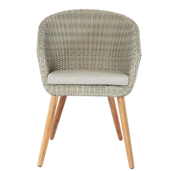Productbeschrijving: Deze diningstoel van het merk Royal Patio is gemaakt van aluminium frame met half rond wicker en acacia houten poten. Deze tuinstoel valt binnen de Vigo serie.