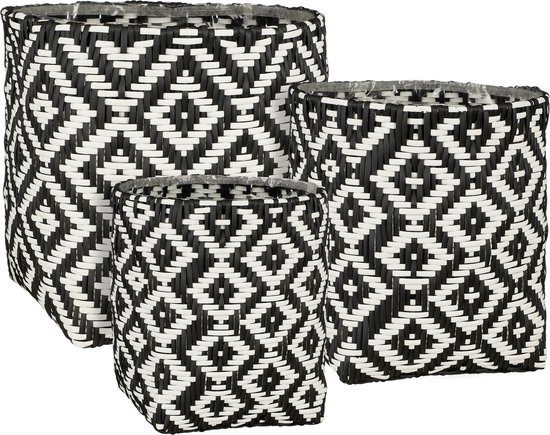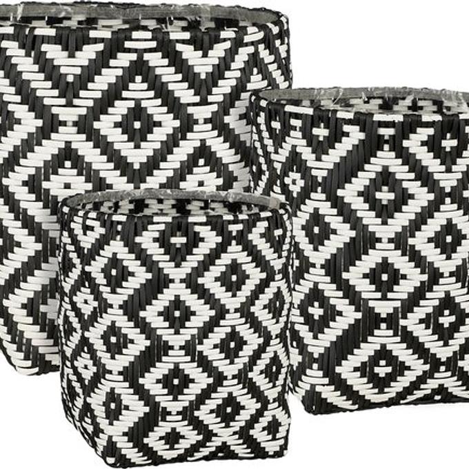 Productbeschrijving: Partij van 32 plantenmanden van Mica Decorations en twee palletdozen met agenda's boeken en kalenders (1436 stuks). De plantenmanden voor buiten zijn vervaardigd van plastic. De set bestaat uit drie manden met afmetingen van H30 x Ø27 cm, H32 x Ø30 cm en H35 x Ø34 cm. Deze formaten zijn ideaal voor planten of een klein boompje. De binnenkant van de manden is voorzien van een plastic liner, waardoor je er gemakkelijk een plant in kunt potten.