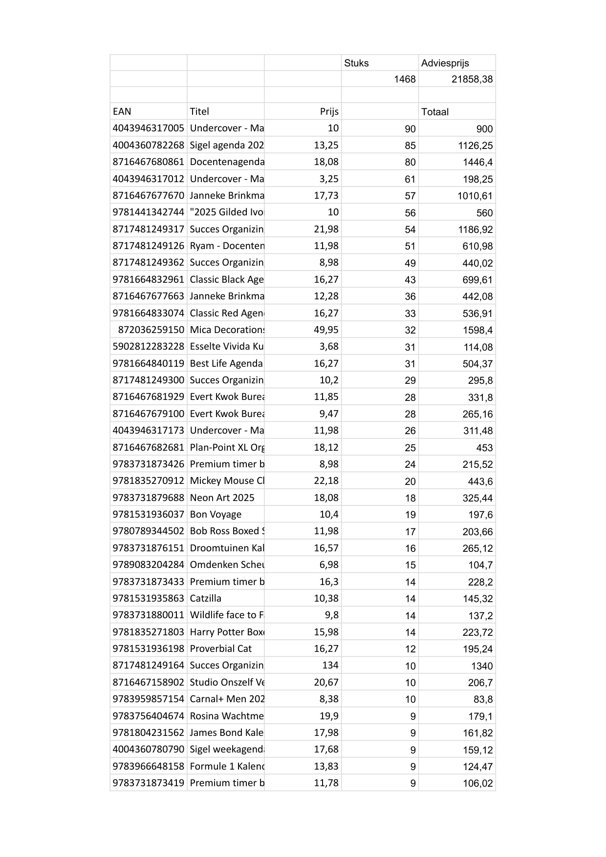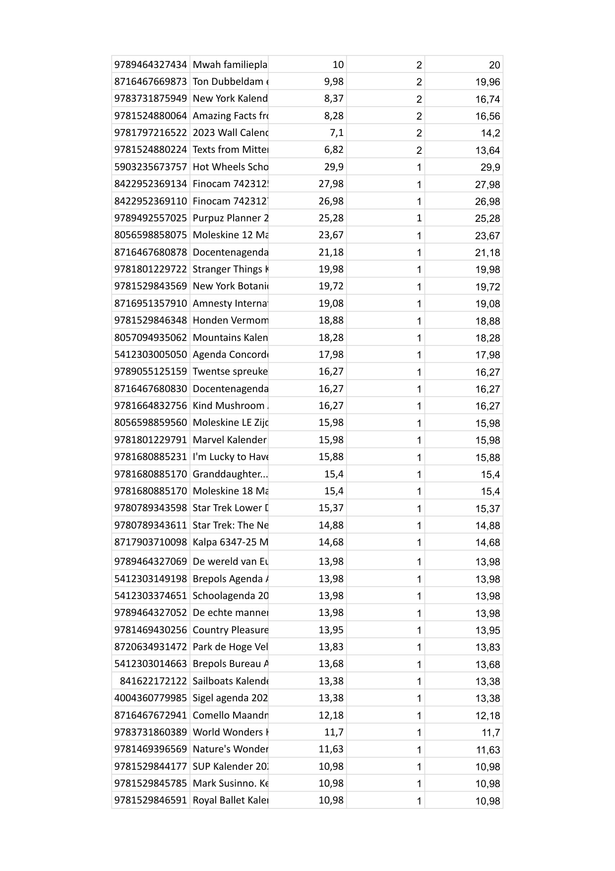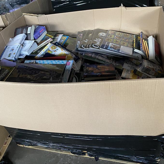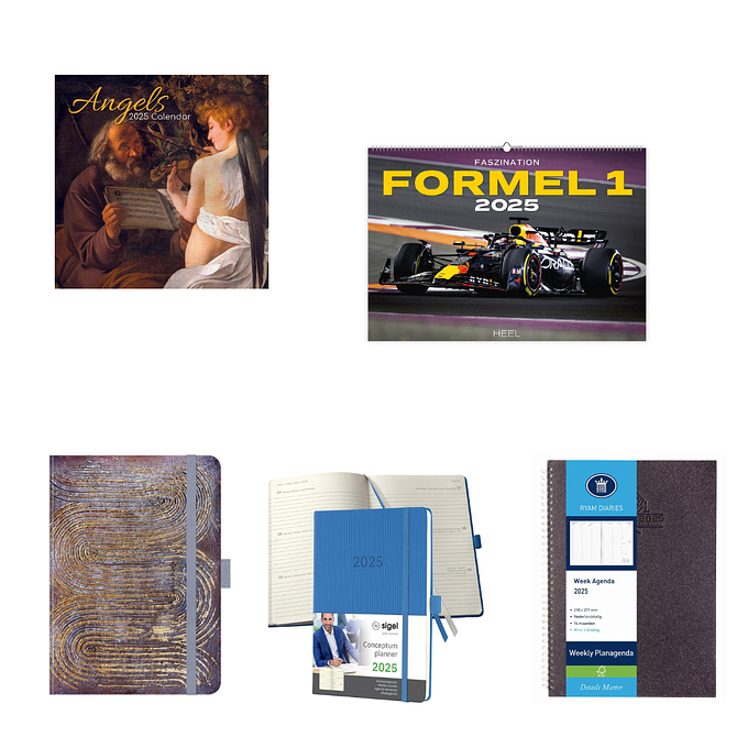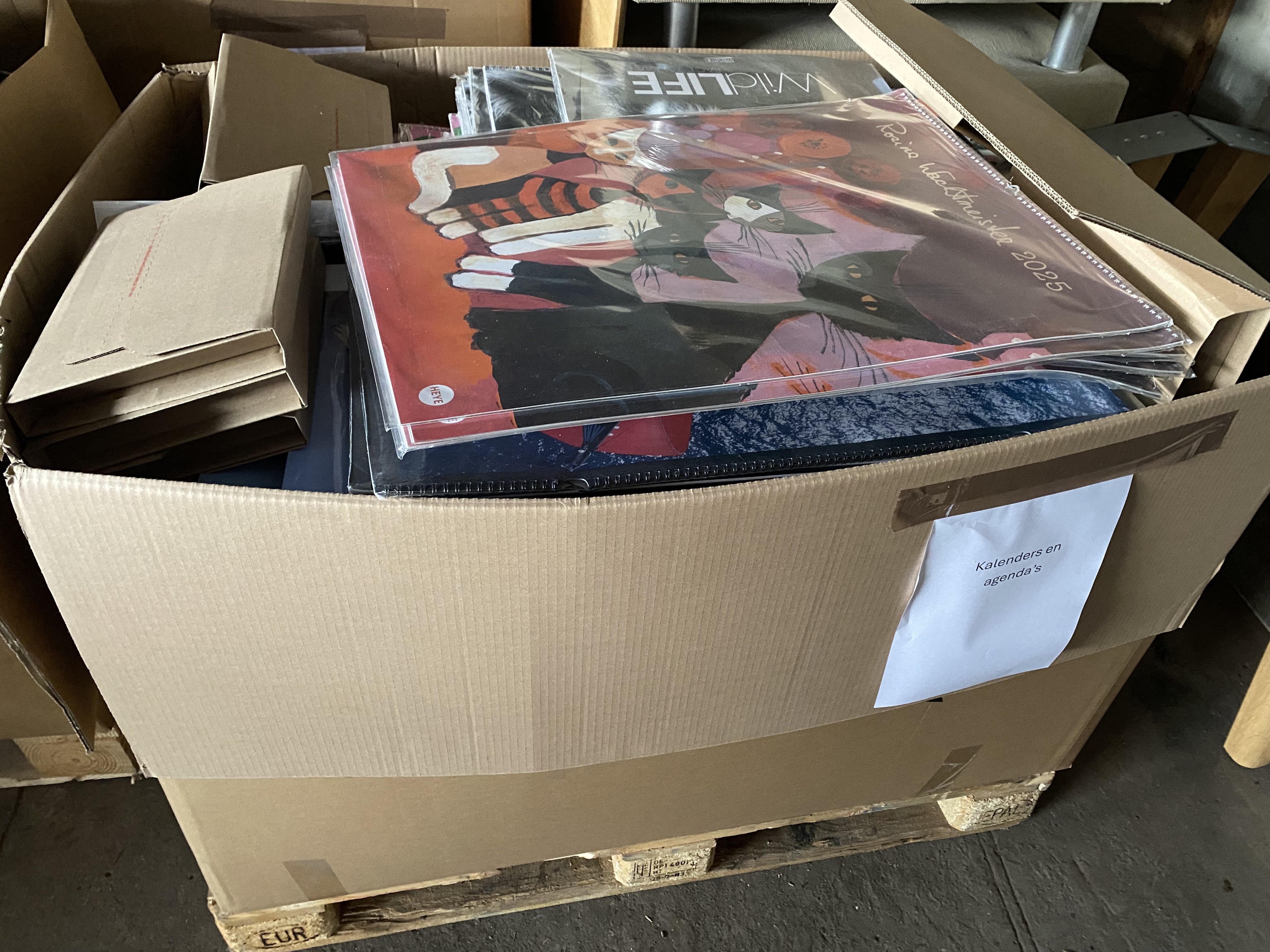 32x Merlijn set. van 3 plantenmanden en 2 palletdozen met agenda's, boeken en kalenders.