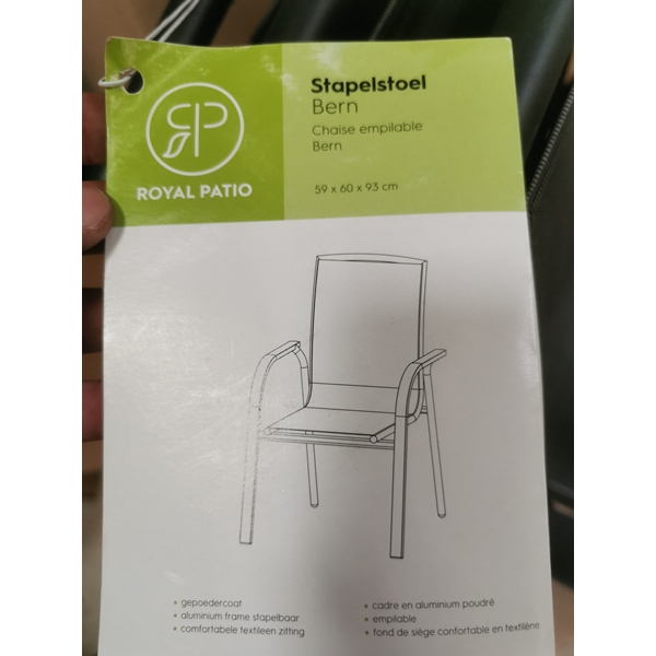 Productbeschrijving: Deze stapelstoel van het merk Royal Patio is gemaakt van een gepoedercoat aluminium frame en zitting van textileen.