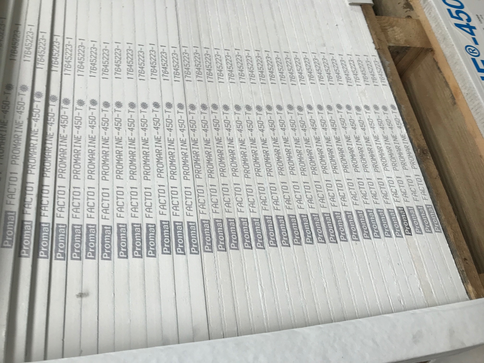Productbeschrijving: Promarine 450 wordt gebruikt als brandwerende wandpanelen, plafondpanelen en vloerpanelen in verschillende ruimtes. Het verschil tussen de twee varianten is dat de 450 variant een stuk lichter is dan de 640. Om precies te zijn 450kg/m³ ten opzichte van 640kg/m³. Vooral voor bij het gebruik als plafondpanelen is dat een welkom voordeel. Promarine 450 wordt gemaakt van calciumsilicaat, verrijkt met mineralen en vezels. Voldoet volledig aan de eisen van Marine Equipment Directive 96/98/EC (volgens Directive 98/95 en Directive 2001/53). Een Promarine paneel is sterk en robuust en is eenvoudig in gebruik en kan makkelijk verwerkt worden met standaard gereedschap voor houtbewerking.