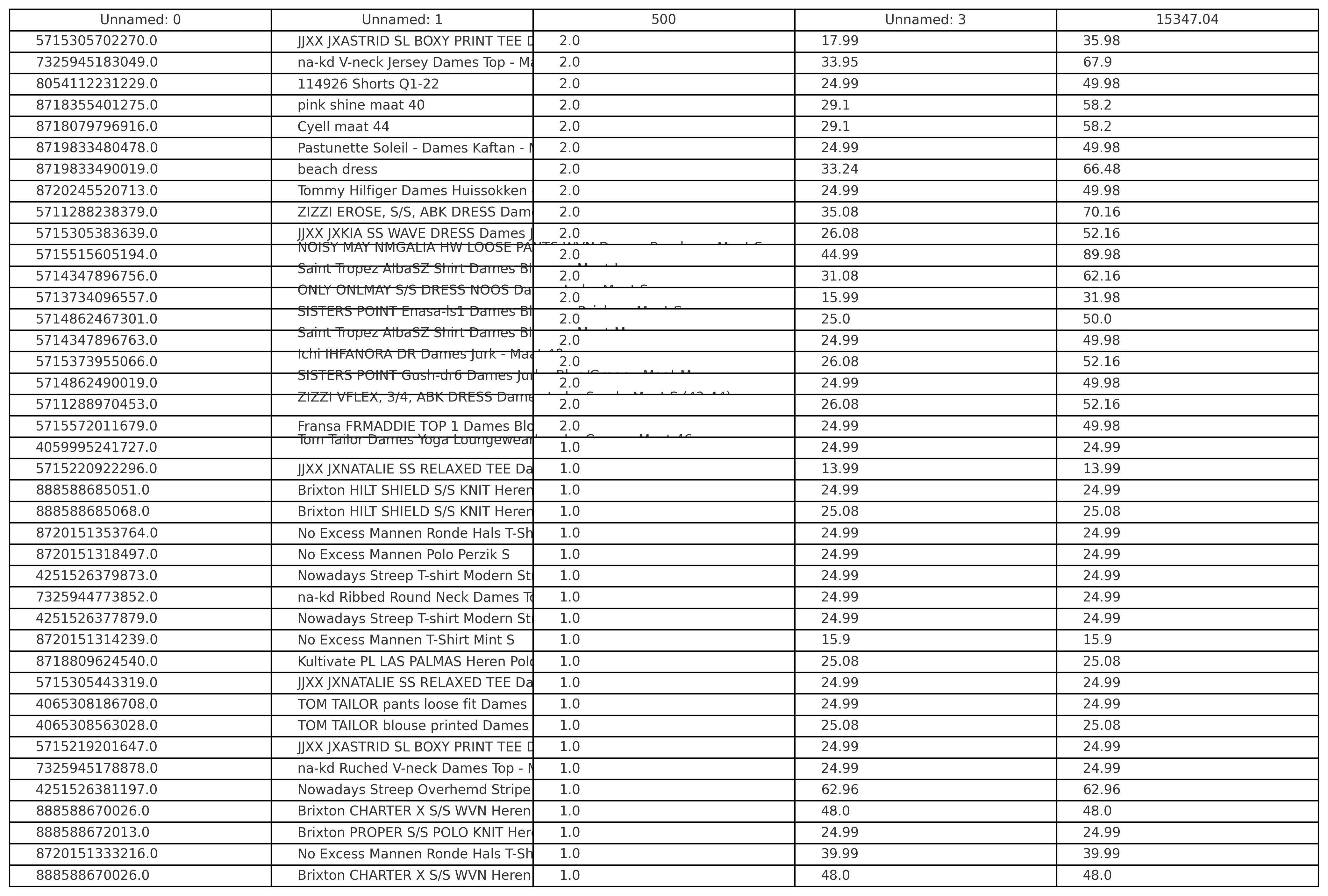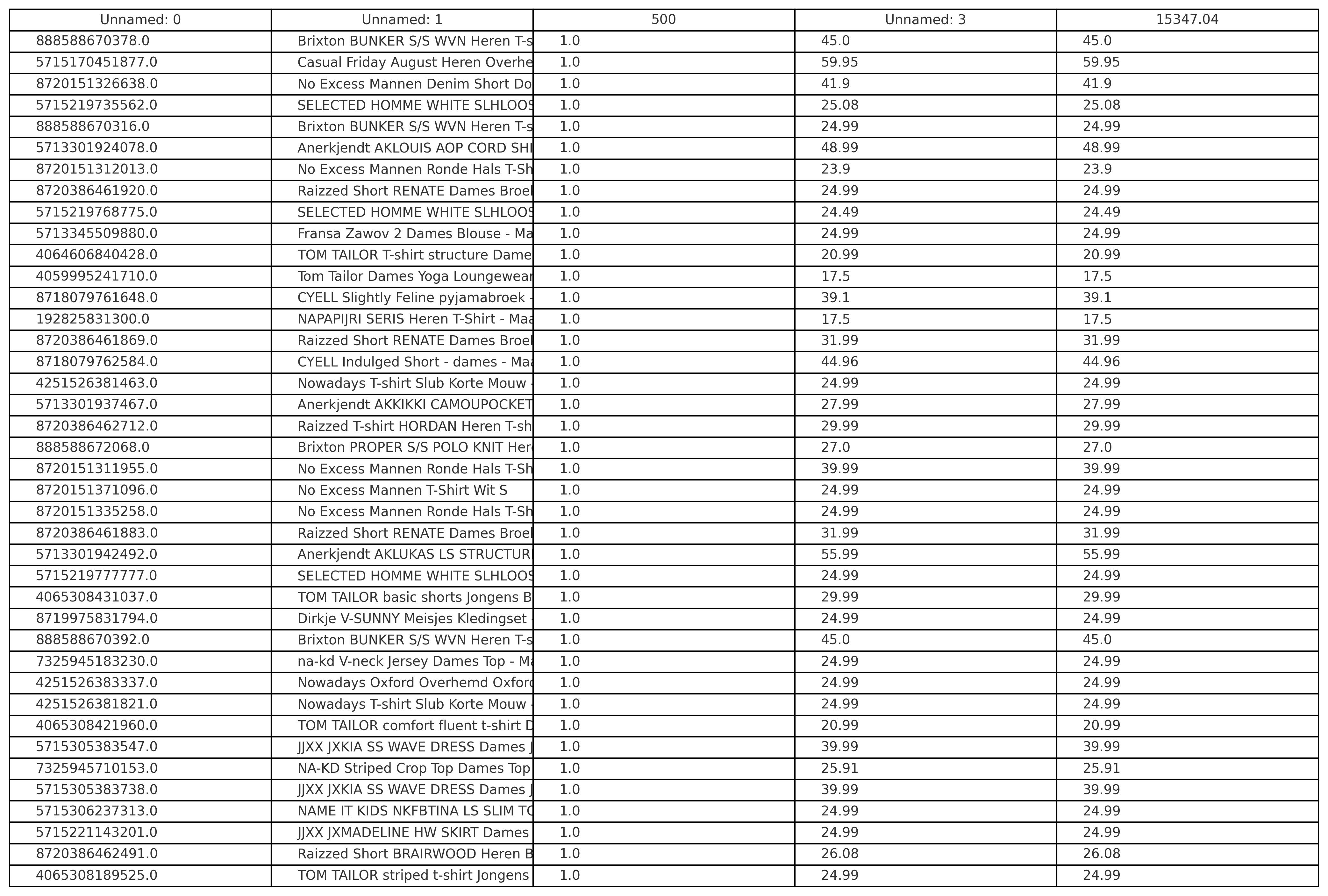 Productbeschrijving: Partij van 500 stuks dames- en herenmode van diverse merken, maten en modellen. Merken die onder andrere in de partij zitten: Tom Tailor, VIla, Nike, Jack & Jones, Vera Moda, Ichi etc.. Bij de foto's zijn de lijsten met de producten, adviesprijzen en omschrijvingen opgenomen. De volledige partij bestaat uit nieuwe items