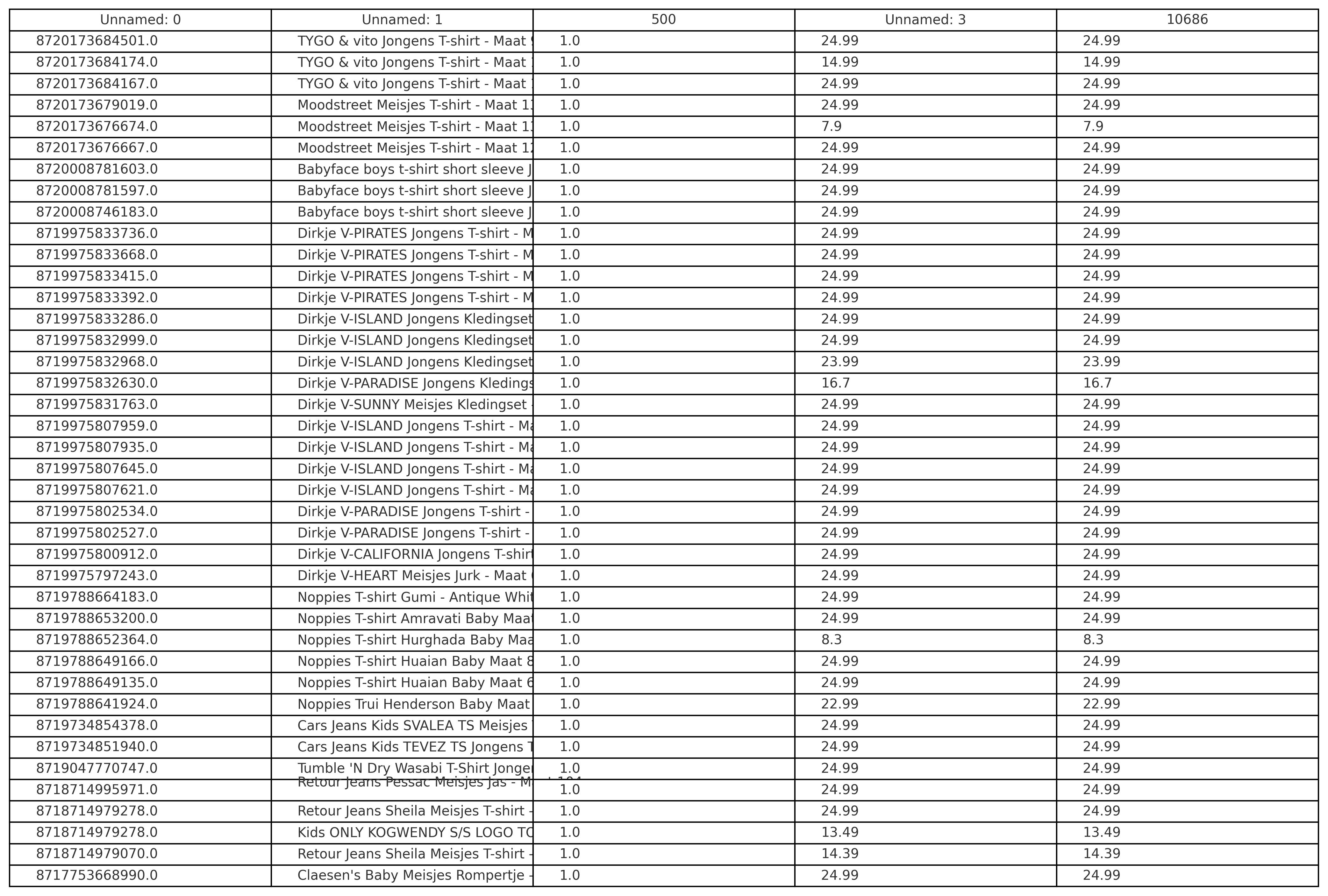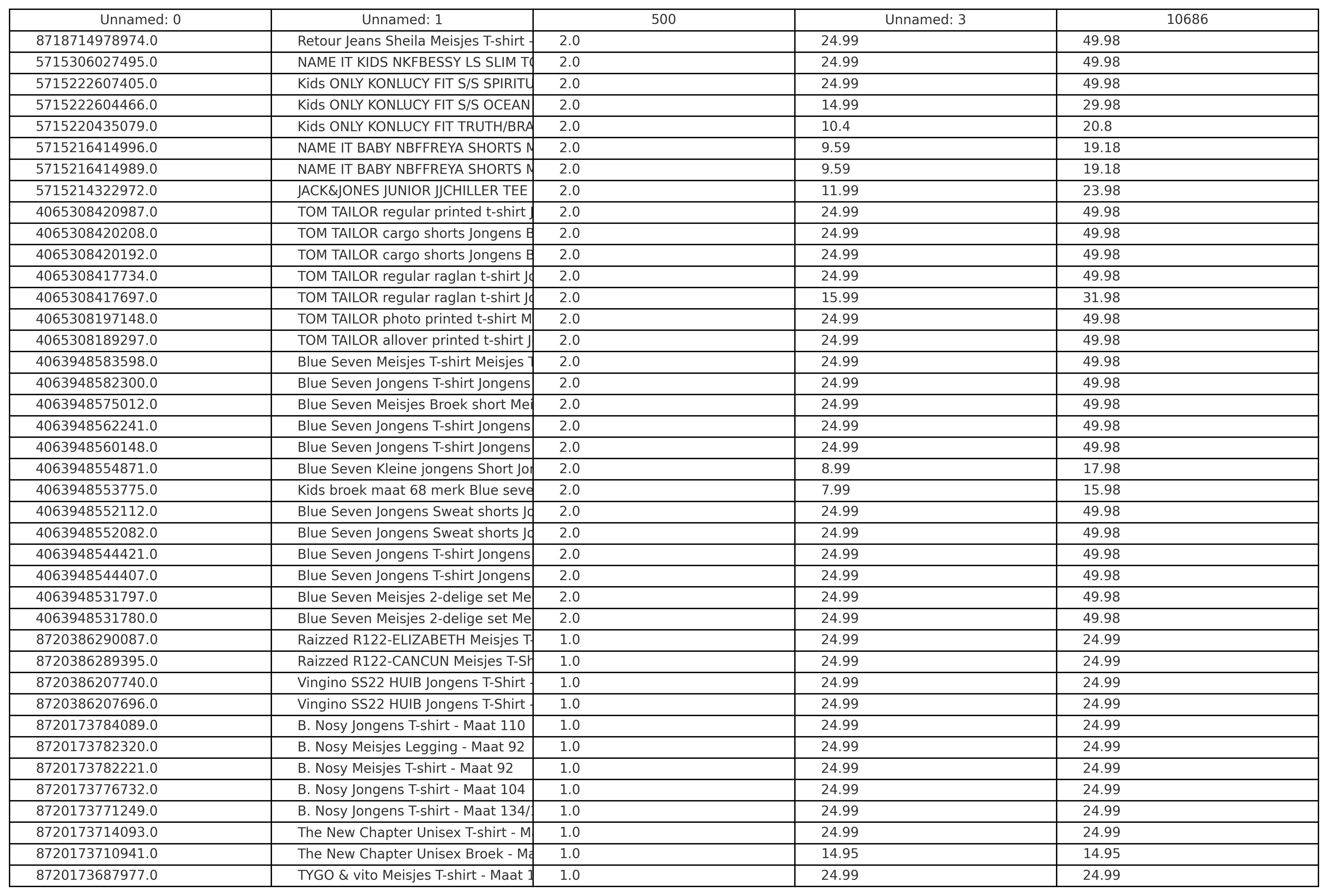 Productbeschrijving: Partij van 500 stuks kinderkleding van diverse merken, maten en modellen. Merken die onder andrere in de partij zitten: Vingino, Dirkje, NAME IT, B. Nosy, Moodstreet, Retour Jeans, Blue Seven, Raizzed, Noppies, Babyface etc. Bij de foto's zijn de lijsten met de producten, adviesprijzen en omschrijvingen opgenomen. De volledige partij bestaat uit nieuwe items