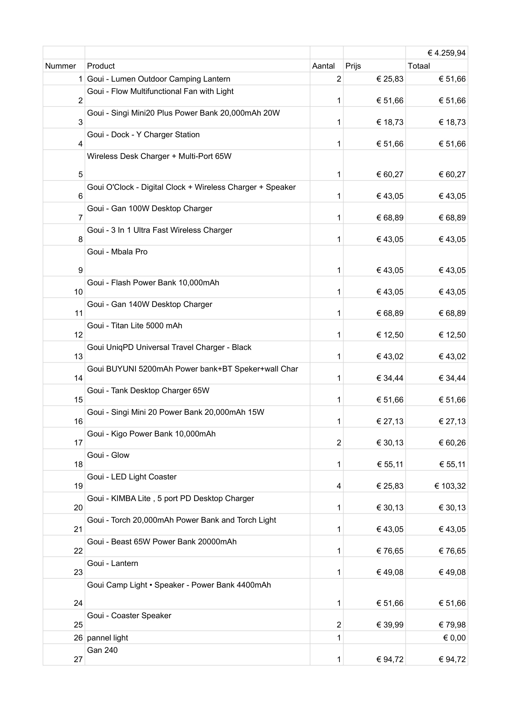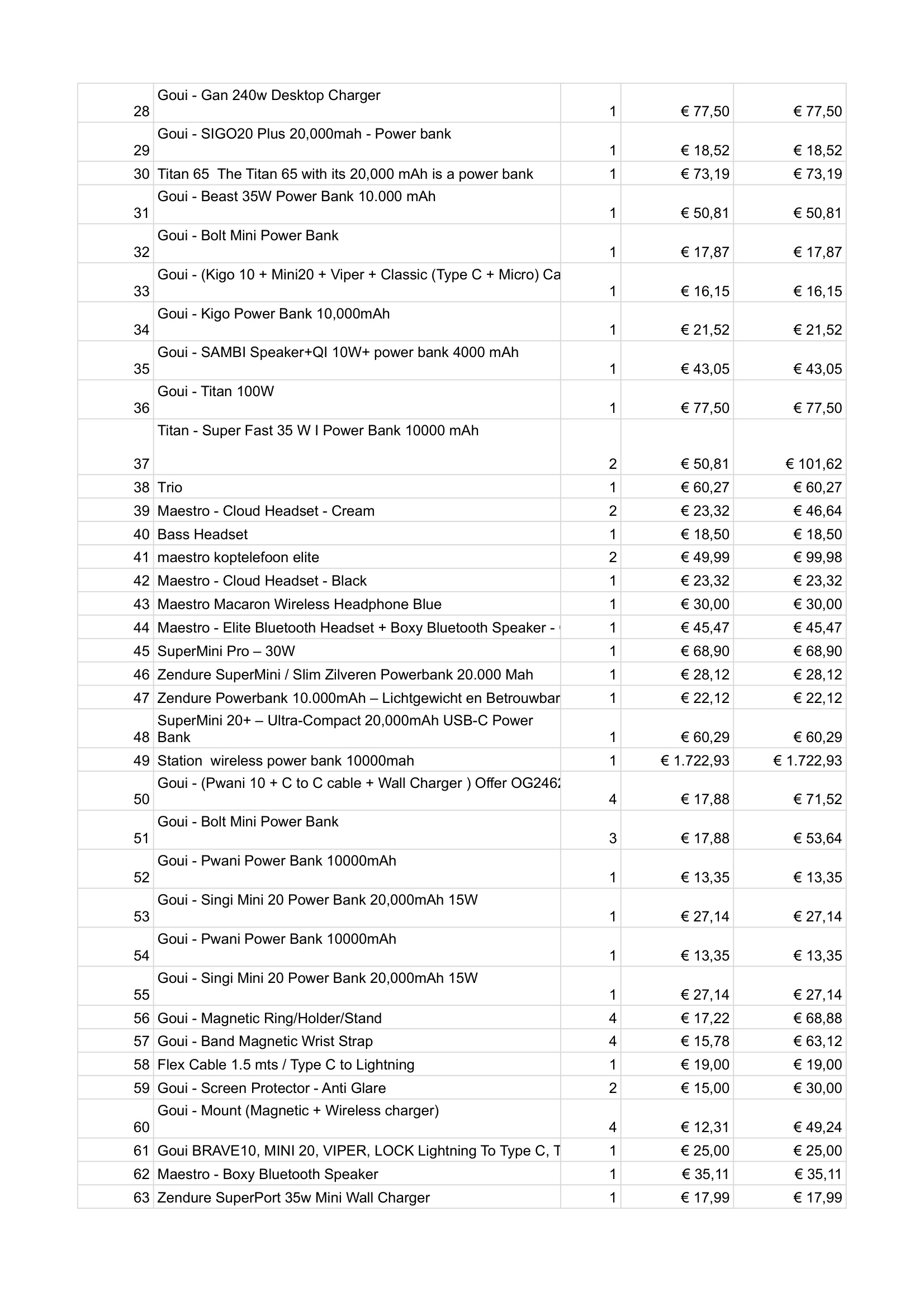 Productbeschrijving: Partij van 68 stuks Goui elektronica. Diverse producten van powerbanks, headsets, oplaadkabels, speakers etc. Voor de volledige lijst met alle producten, zie afbeeldingen.