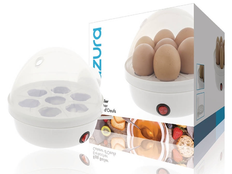 Productbeschrijving: Of je nou van hardgekookt, halfzacht of zacht houdt, de Azura eierkoker garandeert het perfecte resultaat. Er kunnen 7 eieren in tegelijk worden bereid. De eierkoker is voorzien van een eierprikker en een signaal dat aangeeft wanneer de eieren klaar zijn. Eigenschappen: • Kookt 7 eieren tegelijkertijd • Verlichte aan/uit-knop • Uitneembaar eierrek om de eieren met één hand te serveren • Eierprikker om een gebarsten schaal te voorkomen • Signaal dat aangeeft dat de eieren klaar zijn • Maatbeker voor de juiste hoeveelheid water Inhoud verpakking: 1x Eierkoker, 1x Maatbeker, Handleiding