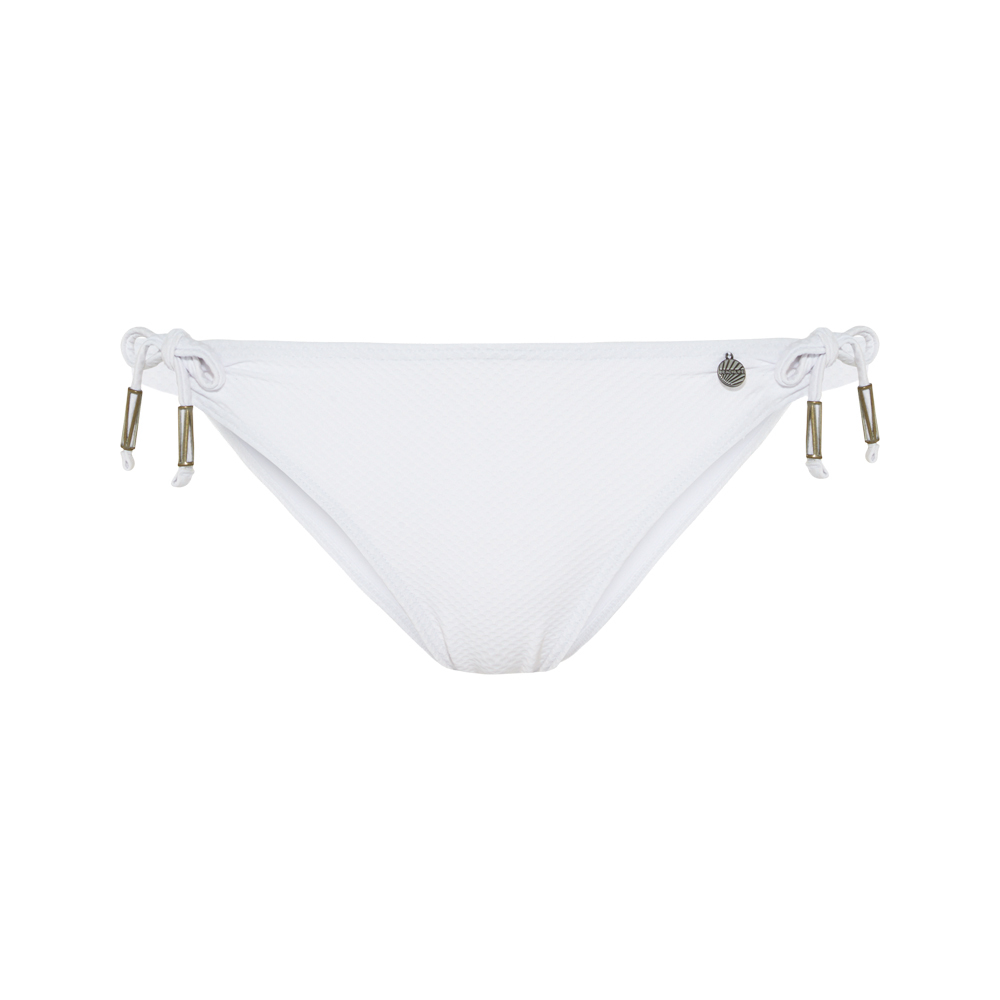Productbeschrijving: Beachlife White bikinibroekje met gestrikte koordjes aan de zijkanten en een patch in de vorm van een kusje op de achterkant. Ook de koordjes hebben leuke details aan de uiteindes. Dit model broekje heeft een normale pasvorm. Het bikinibroekje is uitgevoerd in White. De witte stof heeft een mooie structuur, dat maakt het dan ook extra opvallend! De stof heeft een ingeweven textuurpatroon met kleine ovaaltjes. De combinatie van de witte kleur met het patroon zorgt voor een stoere look.
