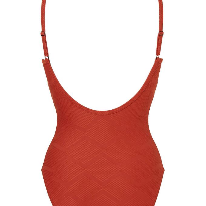 Productbeschrijving: Het Texture badpak van Cyell is uitgevoerd in een rode kleur. De stof van het badpak is voorzien van een mooie textuur. Tussen de cups is een speelse opening aanwezig. De schouderbandjes van het badpak zijn afgewerkt met een goud detail.