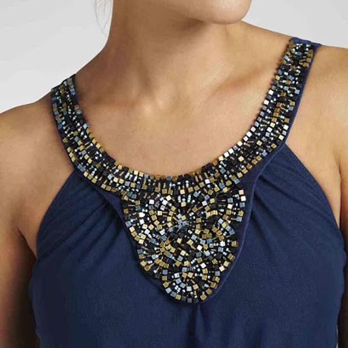 Productbeschrijving: Cyell Platinum Essentials navy 2018 luxe voorgevormd badpak Navyblauw, donkerjeansblauw prachtig versierd met vierkante kraaltjes in 2 tinten blauw en goud en zilver.