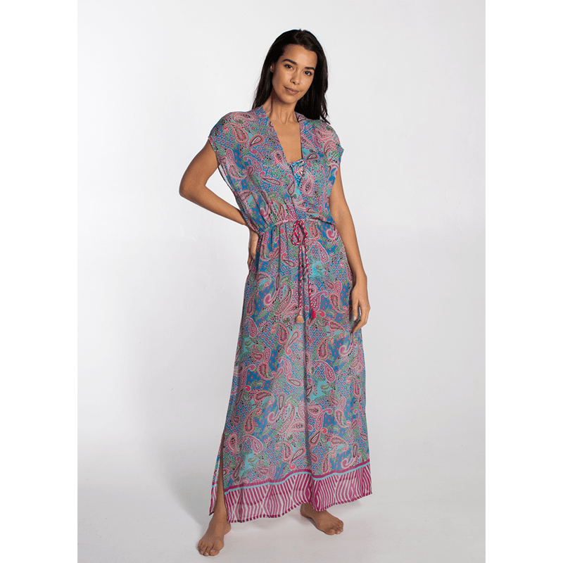 Productbeschrijving: De Sublime lange strandjurk van Cyell is uitgevoerd in een kleurrijke paisley print. Deze hippe jurk valt tot de enkels en heeft een koord in de taille waarmee je het naar eigen wens strakker kan strikken. Het decolleté heeft een mooie v-hals uitsnijding.
