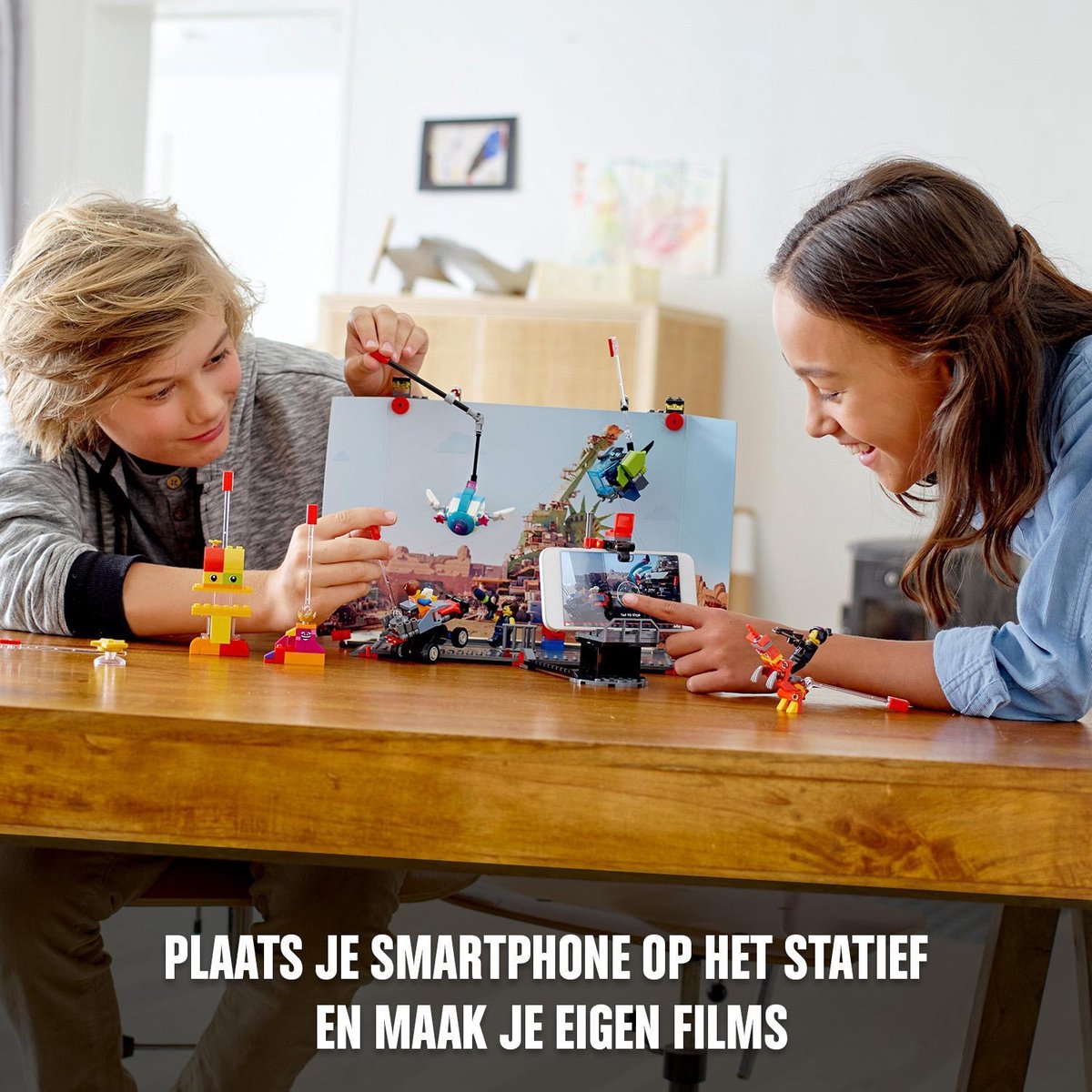 Productbeschrijving: Maak je eigen superfilm met de LEGO Movie Maker set! Bouw het decor en kies voor een achtergrond met Apocalypsstad of het Zusterstelsel. Bedenk je eigen scènes met Emmet, Lucy, Rex en andere geweldige personages. Zet de actiebenodigdheden klaar, zoals Emmets vluchtbuggy en Rex' Rexplorer. Plaats vervolgens je smartphone op het statief en film je eigen, geweldige versie van De LEGO® Film 2!