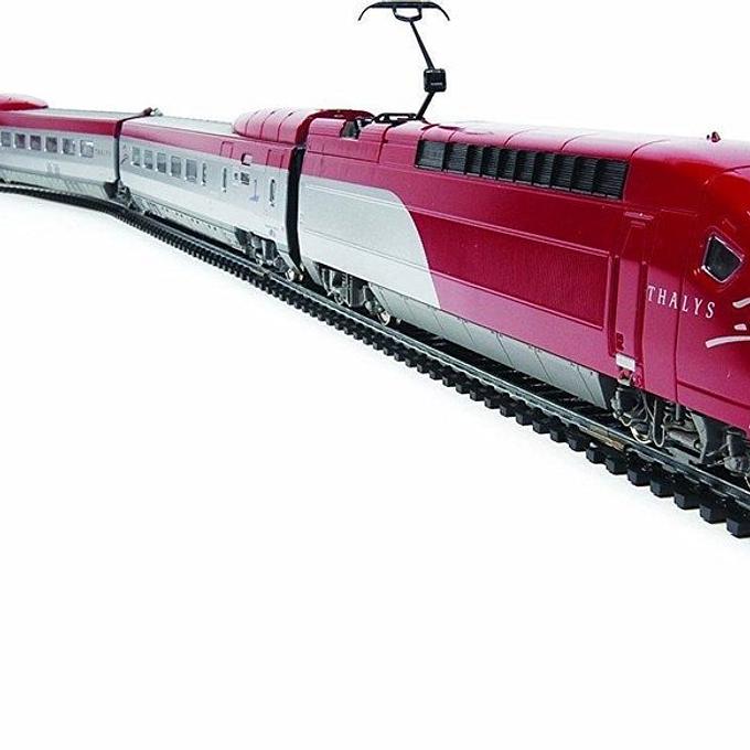 Productbeschrijving: Fijn afgewerkte elektrische snelheidstrein Thalys met locomotieven, wagons en metalen treinchassis.
