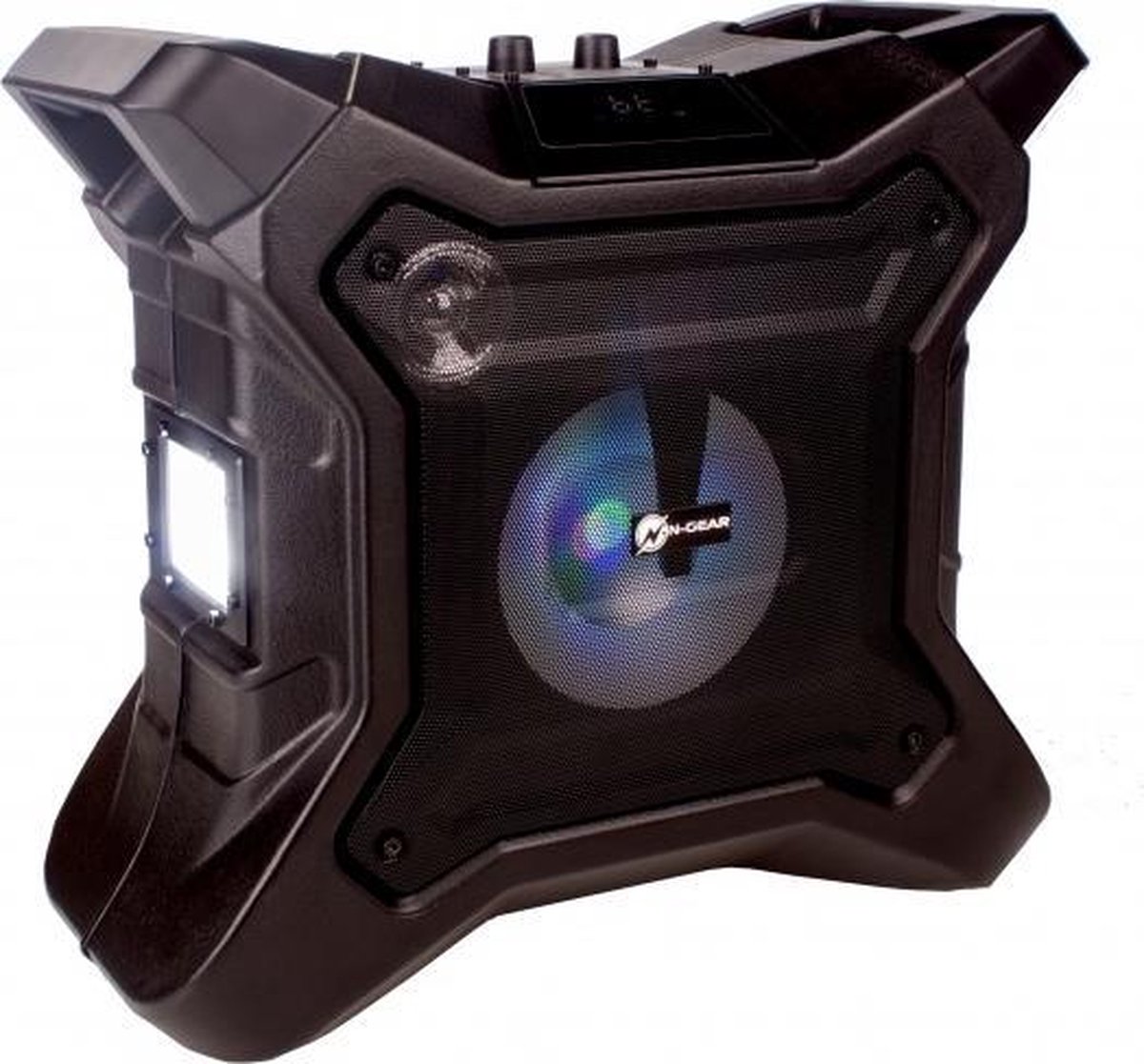 Productbeschrijving: Met de robuuste N-Gear ' The X' bouw je waar je maar wilt een feestje met je favoriete muziek. De speaker is waterdicht (IPX5) en is daarom ideaal om buiten te gebruiken, bijvoorbeeld op de bouw. Met de lichteffecten en meegeleverde microfoon maak je er helemaal jouw show van. Op gemiddeld volume gaat de batterij wel tot 8,5 uur mee en binnen 5 uur is hij weer volledig opgeladen.