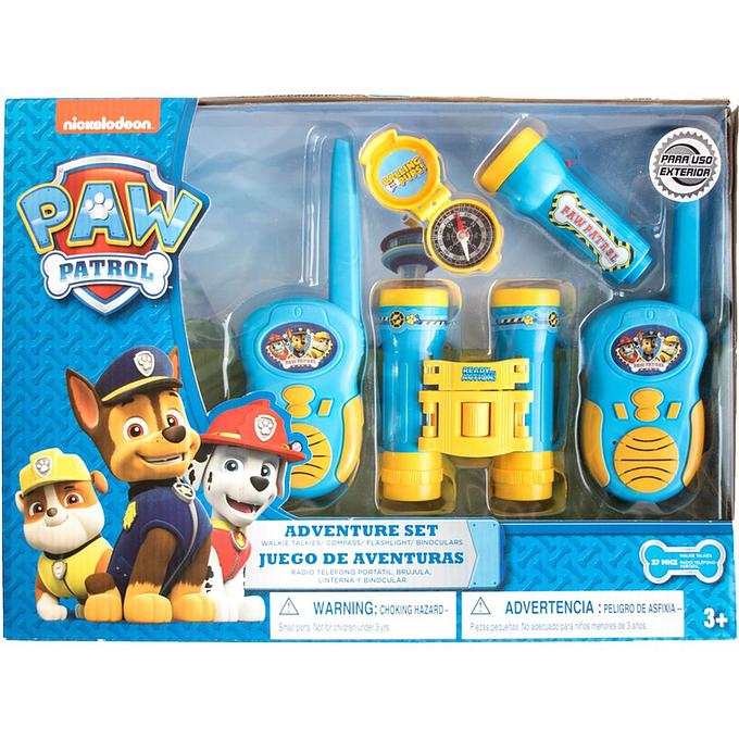 Productbeschrijving: Paw Patrol ontdekkingsreiziger set, bestaande uit: 2 walkie talkies, 1 zaklamp, 1 verrekijker en 1 kompas. De set in blauw met geel bevat opdrukken van de figuren Chase (politie), Marshall (brandweer) en Rubble (bouwvakker).