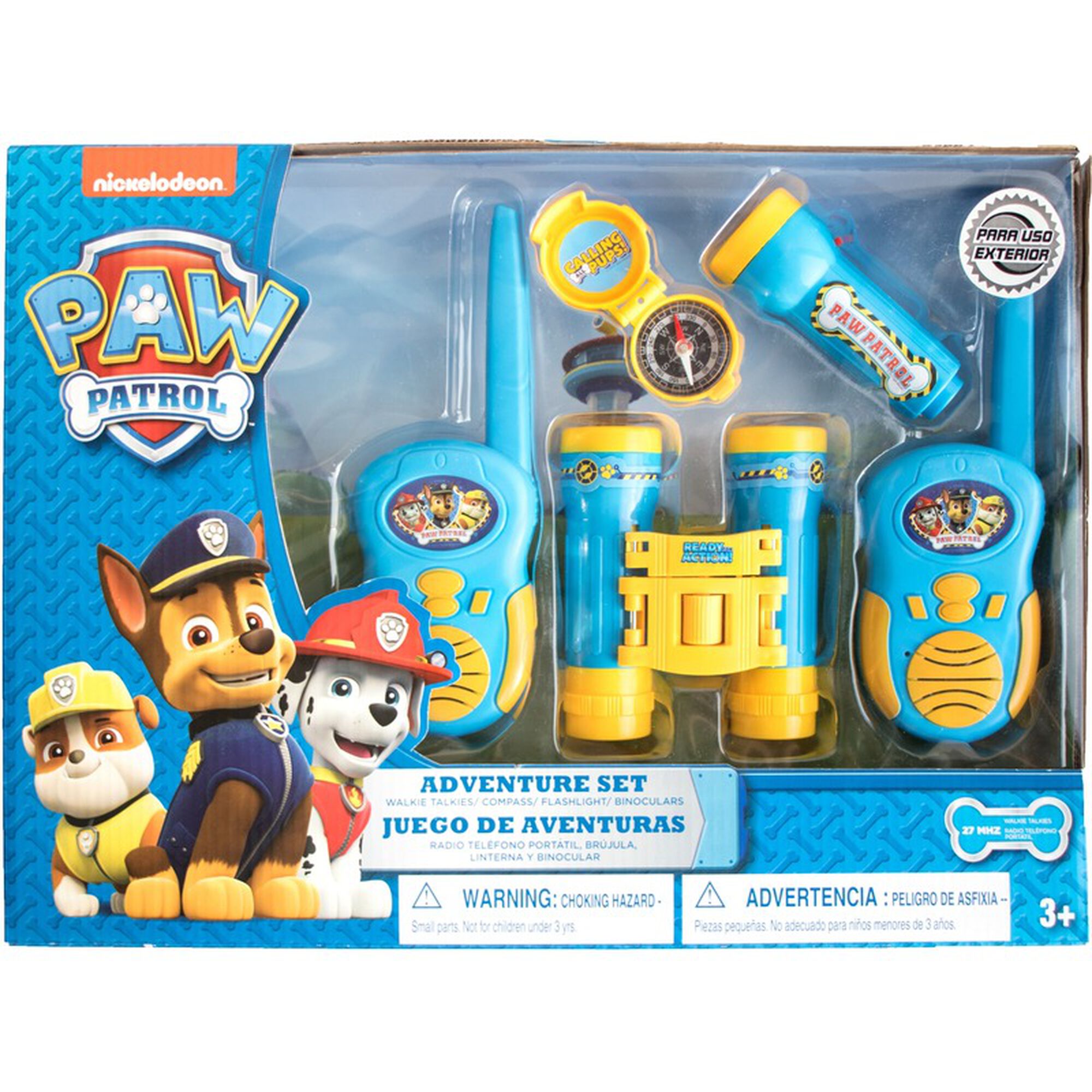 Productbeschrijving: Paw Patrol ontdekkingsreiziger set, bestaande uit: 2 walkie talkies, 1 zaklamp, 1 verrekijker en 1 kompas. De set in blauw met geel bevat opdrukken van de figuren Chase (politie), Marshall (brandweer) en Rubble (bouwvakker).