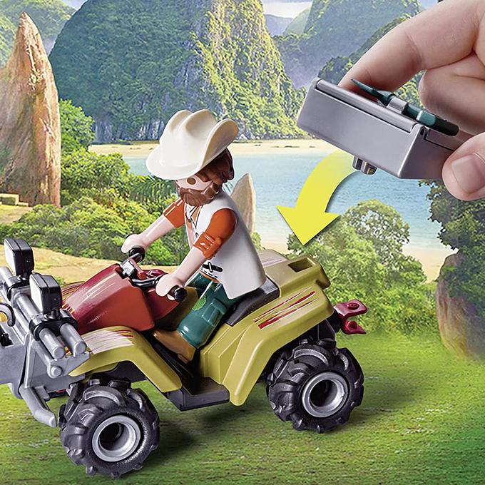 Productbeschrijving: Voorzien van een uitbarstende vulkaan, die wordt geactiveerd met een knop Inclusief een quad Quad bike wordt geleverd met een werkende lier en een koppelhaak Inclusief T-Rex met beweegbare kop, kaak, armen en benen Raptor dinosaurus inclusief Met afsluitbare kooi