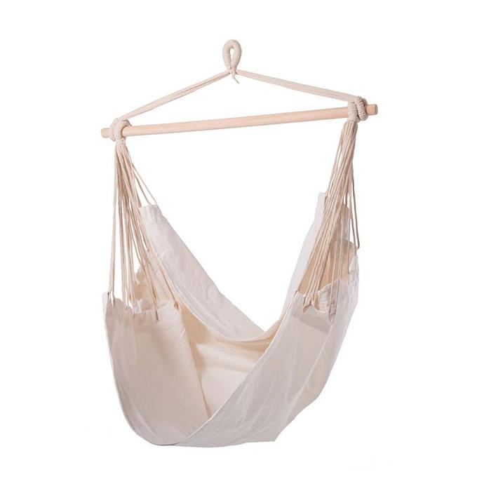Productbeschrijving: Deze hangstoel in de kleur ecru bestaat uit 65% katoen en 35% polyester. Deze hangstoel is ideaal om lekker in te hangen en te ontspannen in jouw tuin. Maar deze hangstoel is ook een trendy aanwinst voor binnen. De hangstoel is inclusief spreidingsbalk (95 cm) voor perfecte comfort. De afmeting van deze hangmat is: 150 x 120 cm.
