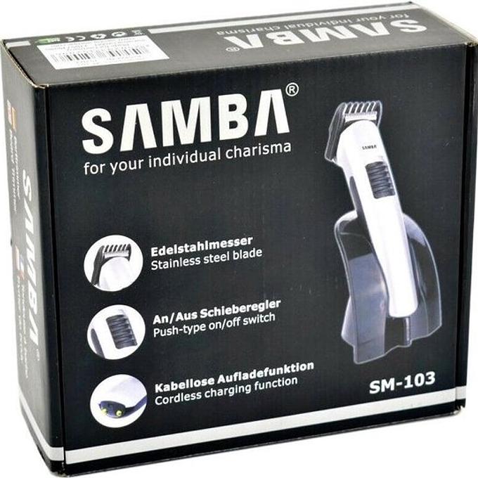 Bestaande uit: 1 x Samba SM-104 baard- en tondeuse. 1 x afneembare opzetkam. 1 x reinigingsborstel. 1 x smeerolie. 1 x netsnoer. 1 x handleiding (Duits).