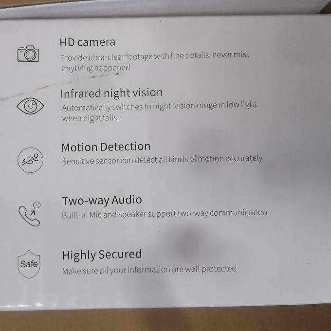 Productbeschrijving: De camera heeft een 2 wegen audio functie, je kan dus horen wat er gebeurd maar ook spreken tegen bijvoorbeeld de pakketbezorger. De camera beschikt over 2 miljoen pixels 1080P high-definition beeldkwaliteit; Infrarood nachtzichtfunctie, wit licht vullicht; draai 355 graden naar links en rechts, 90 graden op en neer; geluid, video, afspelen, alarm en andere functies; Kan aan de muur worden gehangen of op tafel worden geplaatst; USB-power Android-interface, 5V 1.5A voeding; maximale ondersteuning 256G kaart opslag; ondersteuning van cloudopslagdiensten;