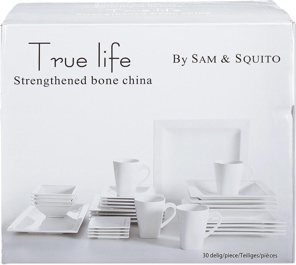 Productbeschrijving: Deze stijlvolle True Life serviesset is perfect om gerechten in stijl op of in te serveren. Een moderne, uit diverse onderdelen bestaande 30-delige serviesset van extra sterk porselein. Deze 30-delige set bevat: 4 cakebordjes 4 gebaksbordjes 4 ontbijtborden 4 platte borden 4 diepe borden 4 schaaltjes 4 mokken 1 serveerbord van 31 x 31 cm 1 rechthoekig bord 31 x 19 cm